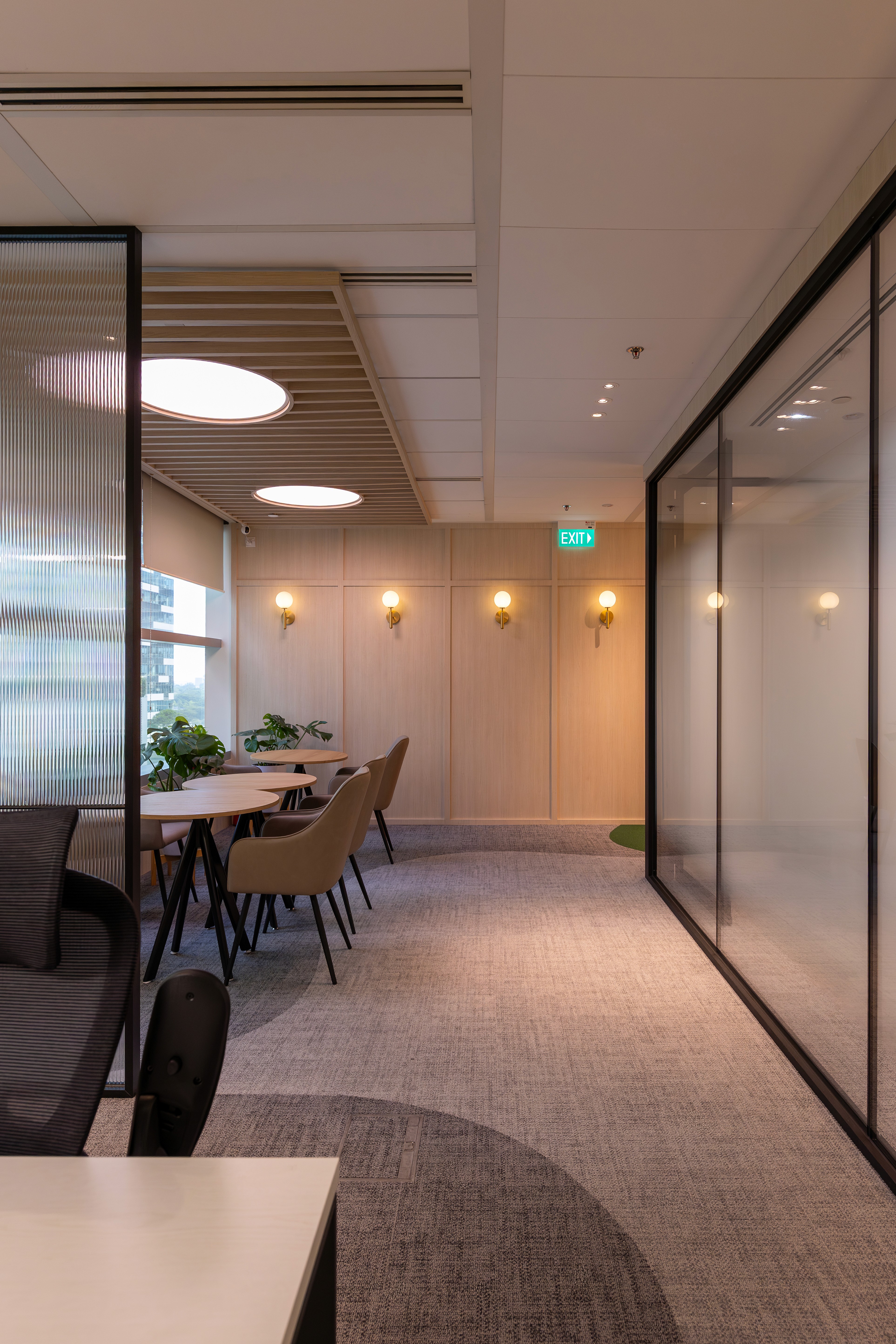 The boardroom is defined by a sculptural double-ring pendant over a full-length sintered stone table. A slate-toned acoustic feature wall with an embossed contour pattern manages sound while adding a distinct visual identity to the room. Frosted glass partitions maintain corridor connectivity without compromising privacy.