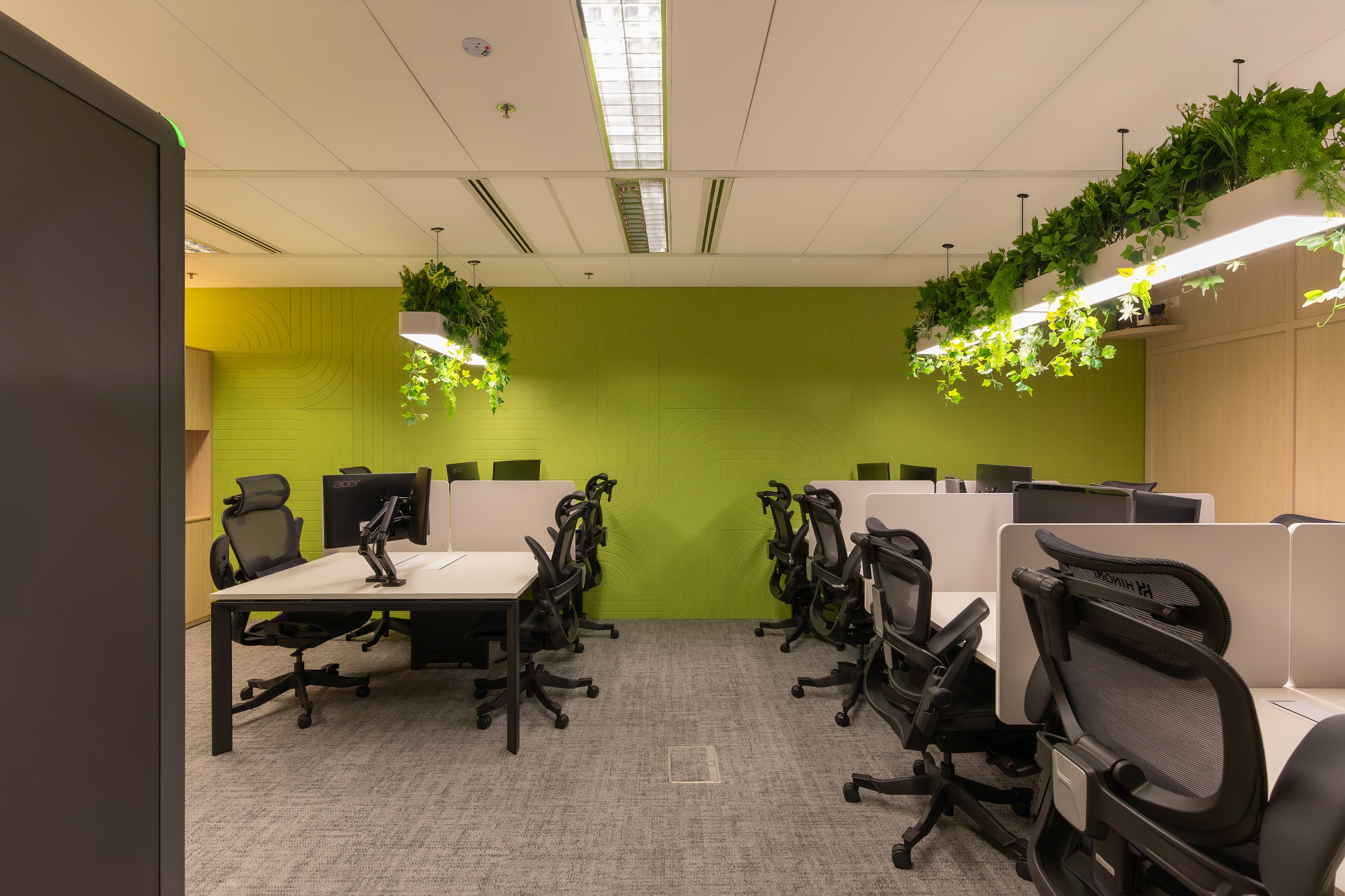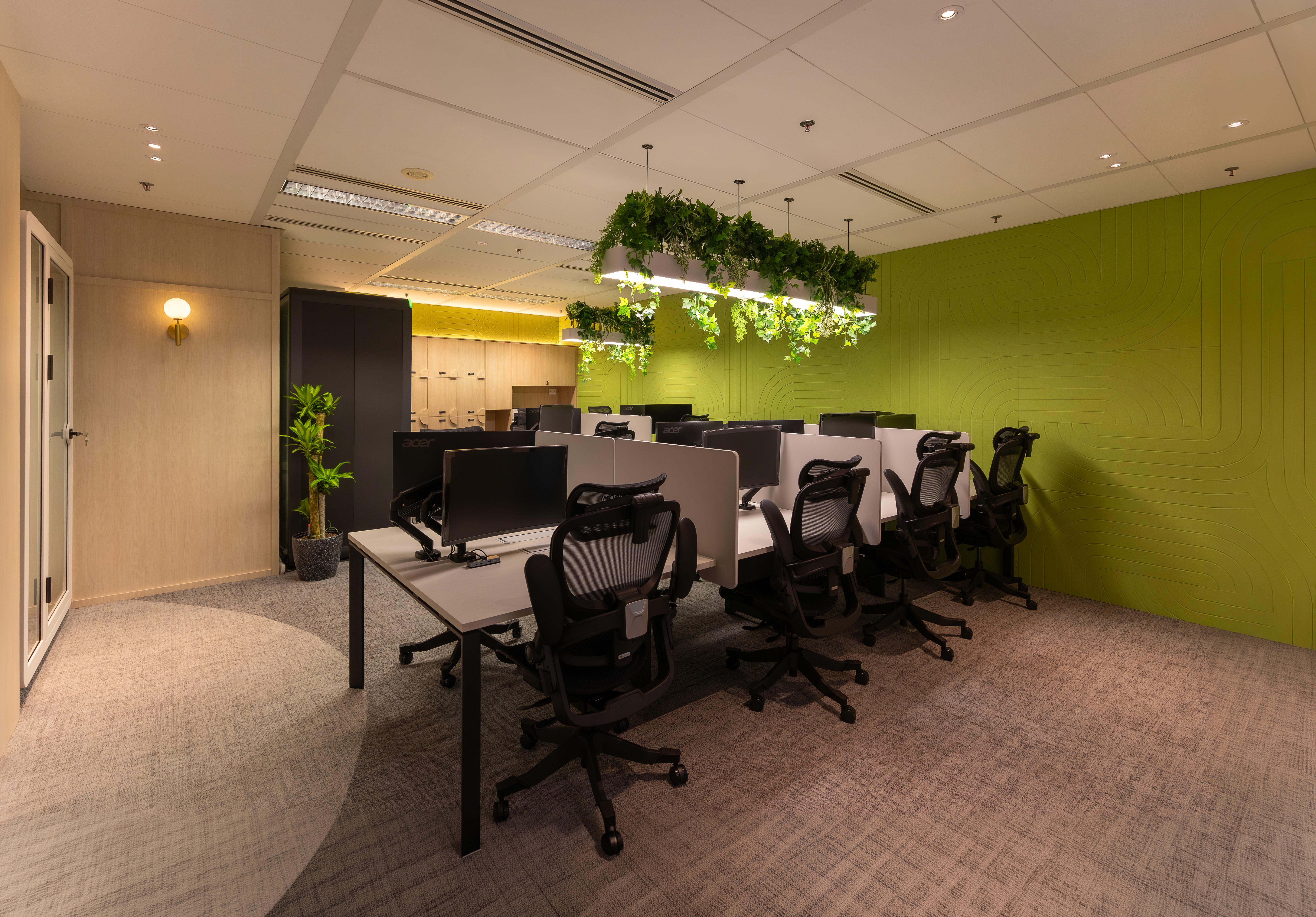 The workspace expansion introduces a bolder design language. A lime green acoustic wall textured with flowing contour lines anchors the workstation area, while suspended planter fixtures integrated into the linear lighting system trail greenery across the ceiling. Timber joinery provides personal storage, and acoustic phone pods offer focused spaces for calls and concentrated work.